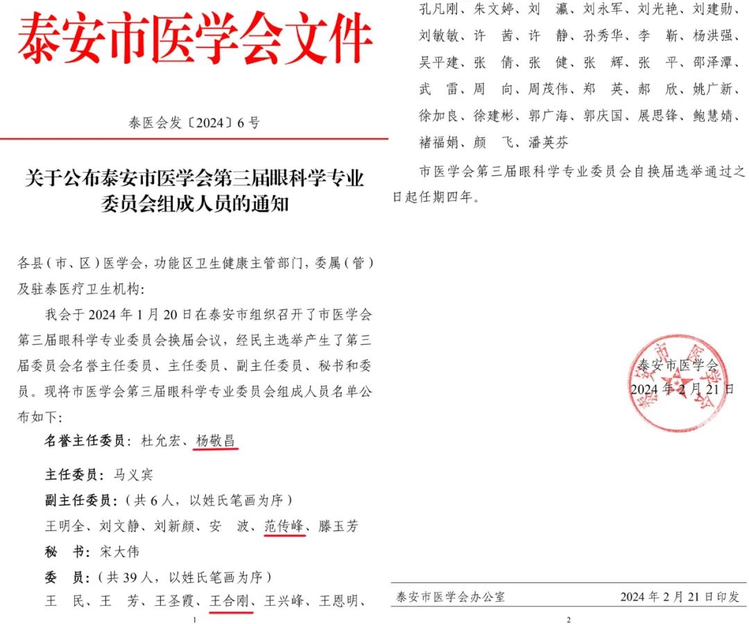 ? ? ?2月21日,泰安市醫(yī)學會正式發(fā)文《關于公布泰安市醫(yī)學會第三屆眼科學專業(yè)委員會組成人員的通知》。我院CEO楊敬昌擔任名譽主任委員、院長范傳峰當選副主任委員、副院長王合剛成為委員之一。