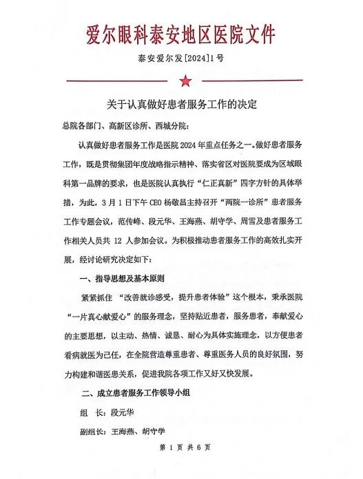為進(jìn)一步鞏固提升醫(yī)院優(yōu)質(zhì)服務(wù)成果,持續(xù)深化“以患者為中心”的現(xiàn)代化醫(yī)院優(yōu)質(zhì)服務(wù)建設(shè),3月6日下午,愛爾眼科泰安地區(qū)召開“篤志患者服務(wù) 提升綜合實力 推動醫(yī)院高質(zhì)量發(fā)展”動員大會,泰安光明愛爾眼科醫(yī)院(總院)全體員工及泰安愛爾眼科醫(yī)院(分院)各科主任及員工代表、高新區(qū)診所全體員工參加會議。愛爾眼科泰安地區(qū)總院長范傳峰主持會議。 01領(lǐng)導(dǎo)講話 行政副院長、患者服務(wù)小組組長段元華宣讀愛爾眼科泰安地區(qū)2024年1號文件《關(guān)于認(rèn)真做好患者服務(wù)工作的決定》,并對各部門具體實施方案進(jìn)行了部署。 行政副院長段元華表示,“全面改善就診感受,提升患者體驗”是我院綜合服務(wù)水平的根本,也是醫(yī)院高質(zhì)量發(fā)展的迫切需要。因此醫(yī)院秉承“一片真心獻(xiàn)愛心”的服務(wù)理念,成立“患者服務(wù)工作領(lǐng)導(dǎo)小組”,在全院范圍內(nèi)開展以促進(jìn)“提升病人滿意度”為核心的指導(dǎo)、督導(dǎo)工作。 ?CEO楊敬昌做了題為《篤志患者服務(wù) 提升綜合實力?推動醫(yī)院高質(zhì)量發(fā)展》的動員講話,闡明了我院開展好患者服務(wù)工作的重要意義,要求大家進(jìn)一步統(tǒng)一思想,提高認(rèn)識,把工作重點(diǎn)統(tǒng)一到醫(yī)院的決策部署上來,扎實開展優(yōu)質(zhì)服務(wù)工作。 楊敬昌要求大家要大張旗鼓、轟轟烈烈地開展好此項工作,要突出亮點(diǎn)特色,大力唱響“一片真心獻(xiàn)愛心”的服務(wù)口號,把開展好患者服務(wù)工作作為醫(yī)院黨建工作的重要內(nèi)容,將此項工作的貫徹落實提升到一個更高的政治水平,成立“共產(chǎn)黨員志愿者服務(wù)隊”,積極投身其中,發(fā)揮引領(lǐng)作用。 楊敬昌同時強(qiáng)調(diào),開展好患者優(yōu)質(zhì)服務(wù)工作還須做到思路清晰、重點(diǎn)突出,要緊緊圍繞“人員素養(yǎng)、就診環(huán)境、核心服務(wù)流程”三大重點(diǎn)有序開展,要以此項工作為契機(jī)和工作抓手,改善就診環(huán)境,著力提升員工素養(yǎng)水平,優(yōu)化核心服務(wù)流程,提升綜合實力,推進(jìn)醫(yī)院高質(zhì)量發(fā)展。 此次動員部署大會的成功召開,不僅為醫(yī)院工作未來的發(fā)展指明了方向,也為全體醫(yī)護(hù)人員注入了新的動力和信心。醫(yī)院員工紛紛表示,未來將立足崗位、拓展思維、集思廣益,堅持患者至上,為患者提供更高品質(zhì)、更有溫度的醫(yī)療服務(wù),提升廣大患者的就醫(yī)體驗,共同打造百姓人人稱贊的專業(yè)眼科醫(yī)院!